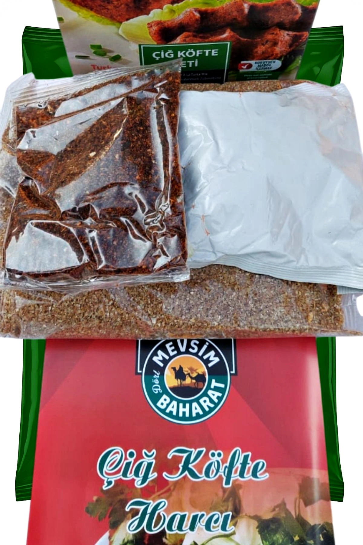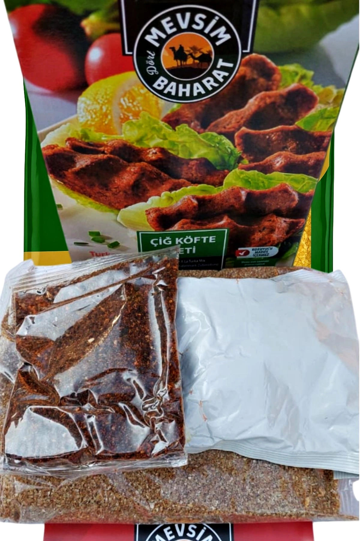 Esmer çiğ köftelik bulgur, acı biber salçası, baharat karışımı (İsot, karabiber, soğan tozu, yenibahar, sarımsak tozu, kimyon, tatlı kırmızı toz biber, acı kırmızı toz biber, tuz.)